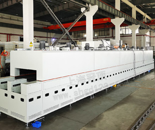 隧道烘箱與標準型烘箱相比,其優點在于自動的加熱干燥,可連續性使用。隧道烘箱主要分為三個部分,即進料區、烘干區、出料區。其工作原理如下:一、進料區:產品進入烘干區前,放置產品的地方,其長度為500mm-1000mm左右。產品通過隧道烘箱進料區自動進入第二部分的烘干區進行加熱、干燥等熱處理作業。二、烘干區:主要是由框架、鼓風電機、加熱管、箱體四部分組成。兩層箱體之間填充保溫隔熱材料。可持續不間斷地烘烤,提高產品生產效率。多段獨立PID溫度控制,爐內溫度均勻。輸送線速度變頻調速,調節自如,運行平穩,生產效率高。三、出料區:按需可加裝散熱風扇,使烘干區的產品加速冷卻,以便下一流程的作業。四、輸送線部分:網帶、板鏈輸送線兩側配有傳動鏈條,解決運輸過程中跑偏的現象。隧道烘箱是分段式加熱,獨立電箱控制、操作方便。結構主要由輸送系統與烘干爐兩大部分組成。
