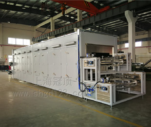 多層固化爐 溫度范圍室溫~+100℃; 溫度波動度±1℃; 溫度均勻度±3℃(恒溫狀態下);升溫速率≥10℃/min 外殼溫度溫升不超過環境+15℃,接縫處周邊除外。電源三相五線制,380V,50HZ總功率140KW 外形尺寸 1. 總長11700*高 2510(不含電機高度)*寬2155mm;(高度變化不得超過±25,寬度不含電機厚度) 2. 進料區長1250mm,加熱區長9200mm,收料區長1250mm; 3. 上層輸送面離地面高1510mm±25mm;下層輸送面離地面高715mm±25mm。 產品尺寸∶ 1.直徑 201mm,長1016mm 2.產能∶12支/H; 3.爐內產品數量120支; 4.固化時間 4H,溫度常溫~+100℃; 5.分上下二層輸送帶,機器人上料,下料位頂緊釋放自動卸料至下料下車,進出工位定位精度±1mm; 6.上料位設有檢測夾具是否頂緊產品傳感器; 7.上料、下料位設有檢測產品有無傳感器; 8.產品橫向放置于輸送帶上輸送,自鎖機構可使得濾芯自轉并向前輸送,轉速 10-60rpm 可調節。 9.上料位-主線體自轉區前獨立自轉,上料時停止。 內膽尺寸加熱區長 9200*內寬1500*上層進料口高為 520mm。 下層進料口高為240mm