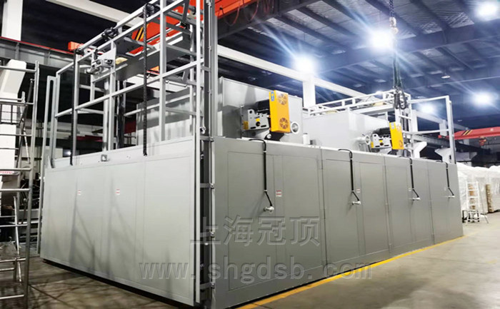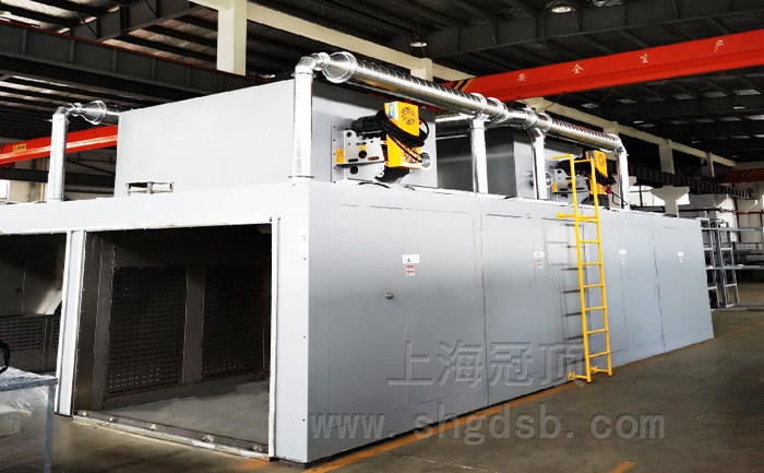 燃氣雙通道烤箱 內(nèi)膽尺寸:寬4600X深8600X高2300mm 外形尺寸(約):寬5200mmX深8900mmX高2300mm(不含升降門機構(gòu)) 溫度范圍:常溫至250℃可調(diào),可恒溫。 溫度波動度:±1℃ 溫度均勻度:±2%℃(恒溫狀態(tài)下,空載測試)。 升溫速率: ≥8℃/min 外殼溫度:溫升不超過環(huán)境+15℃,接縫對接處周邊除外。 循環(huán)風(fēng)方式:熱風(fēng)左右強制循環(huán)運風(fēng),配4臺7.5KW保溫風(fēng)機循環(huán)加熱。 控制電源:三相五線制,480V,60HZ,總功率約33KW。 加熱源:采用2臺進口品牌15萬大卡分體式燃燒機加熱 外殼材料:采用1.5t冷板,表面高溫靜電噴粉處理(顏色7035)。 內(nèi)膽材料:采用1.5mm SUS304不銹鋼板制作,防生銹、耐腐蝕,易清洗。 骨架:采用10#國標(biāo)槽鋼制作。 底板:采用5mm碳鋼板制作,方便推車進出自如,同時起保護車間地面及箱體加固作用。 扶梯:配爬梯一副,便于維護保養(yǎng)使用。 開門方式:爐體前后各配一套電動升降門,提升門電機功率1.5kw2臺。 加熱方:采用燃氣直燃式加熱。 此燃氣雙通道烤箱控制系統(tǒng):采用人機界面操作,三菱觸摸屏、PLC、溫度模塊控溫。 我司專業(yè)生產(chǎn)前后開門烤箱、上下提升門烤箱、前后貫通燃氣烤箱等設(shè)備。具體燃氣輸送式固化爐工藝參數(shù)請來電詳詢:021-67353639,18930058003